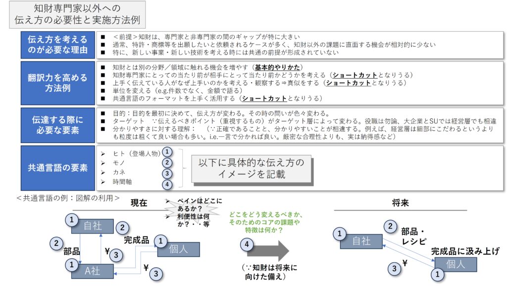 そして、分かりやすく説明する能力を身に付けるには、知財領域とは異なる領域における業務の目線を持ち、その経験値を高めることといった意見も出ました。一方で、それは直ちに改善が見込まれない中、一定程度説明に有用なフォーマットを活用するといった点もシーンや対峙先によっては有用になるといった意見が出ました。