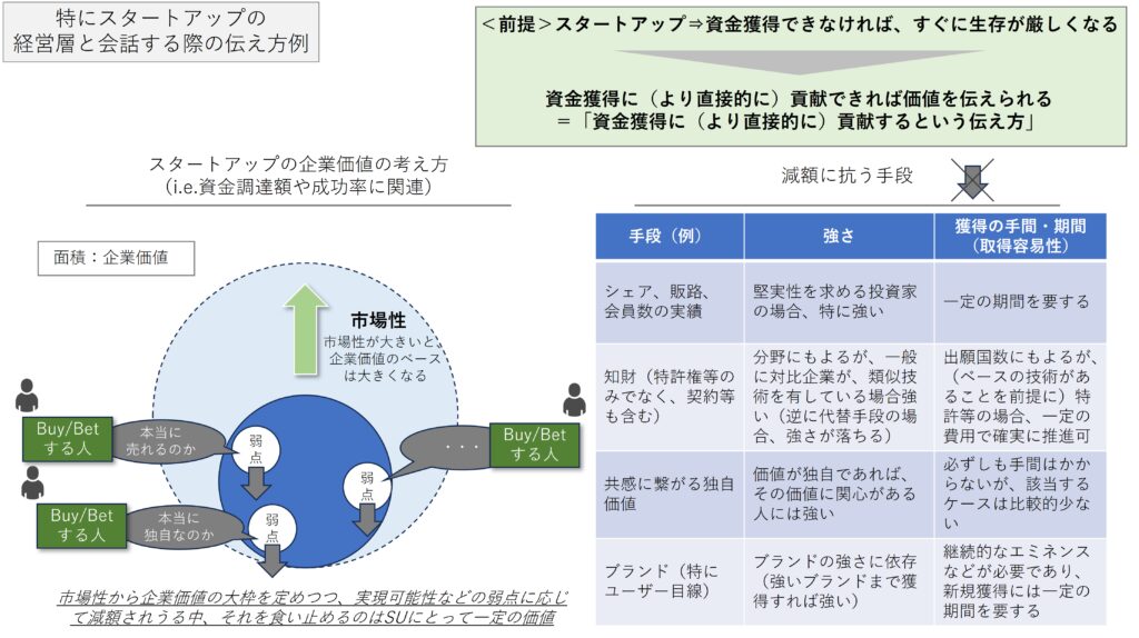 その中で、スタートアップは、資金獲得の手段が途絶えると存続することができない組織体であるため、資金調達の額の向上、成功率の向上、といった面で貢献できるという伝え方が良いのではないかといった意見が出ました。